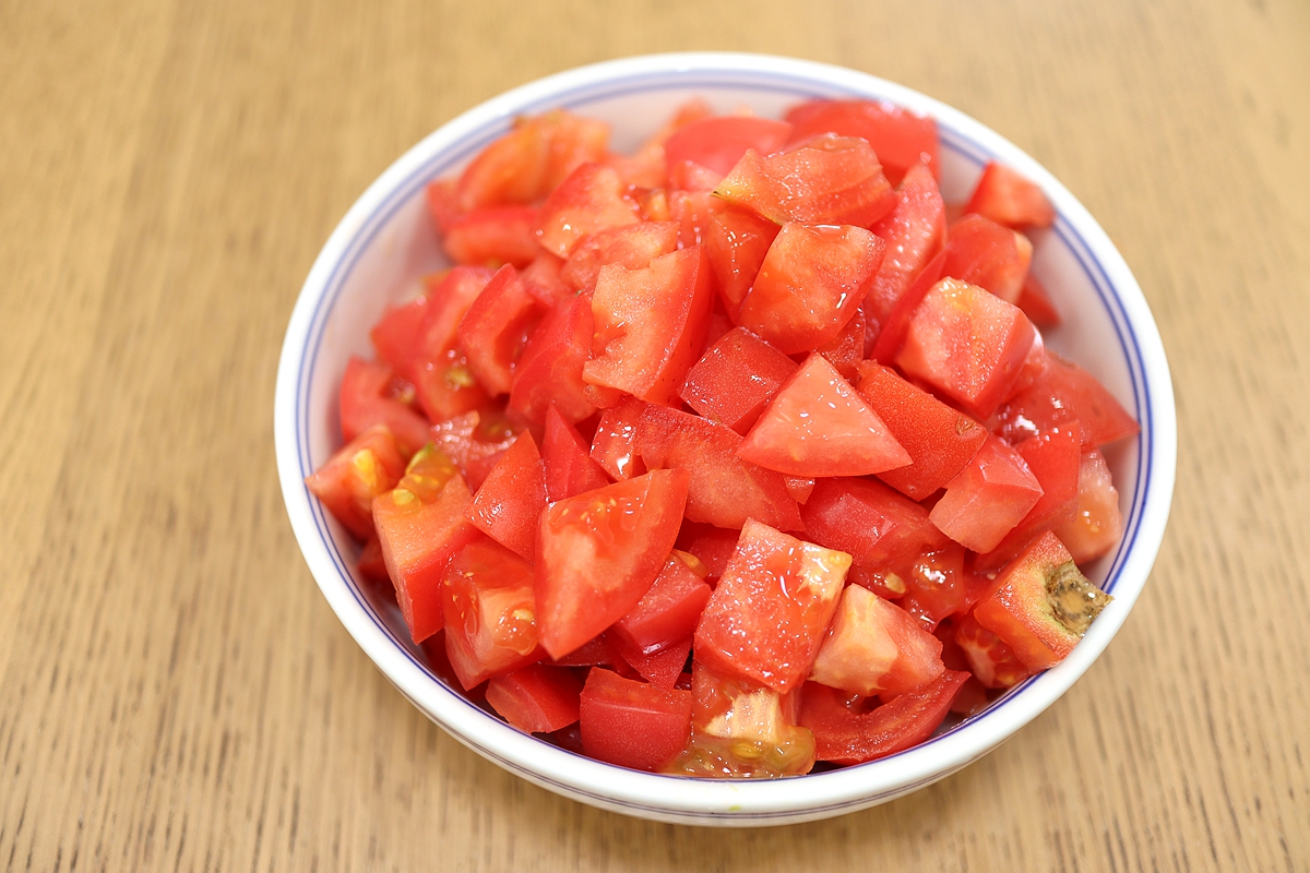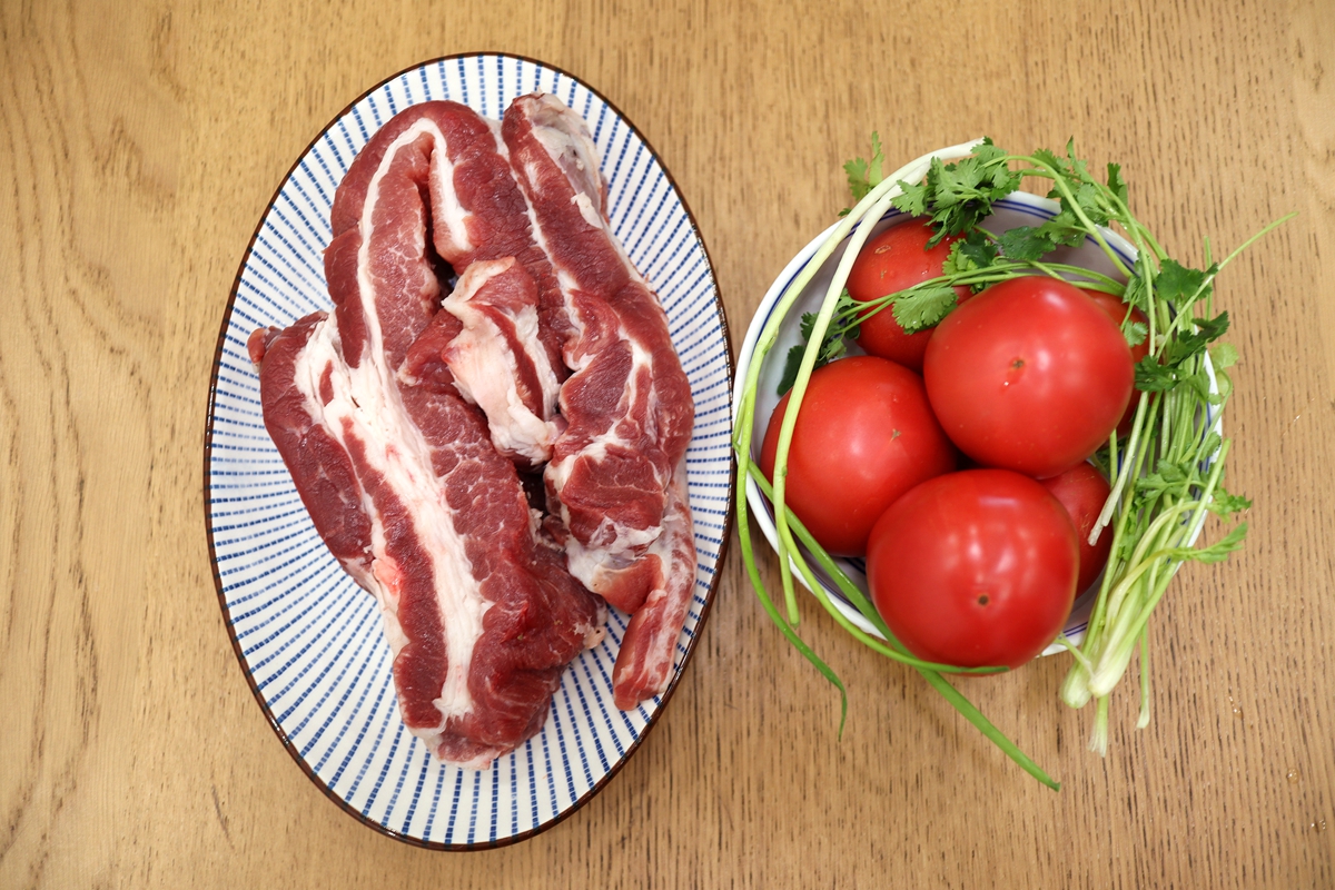 材料:牛腩90克,西红柿6个,香菜1棵,香葱1棵,植物油少许,盐适量,热水1壶