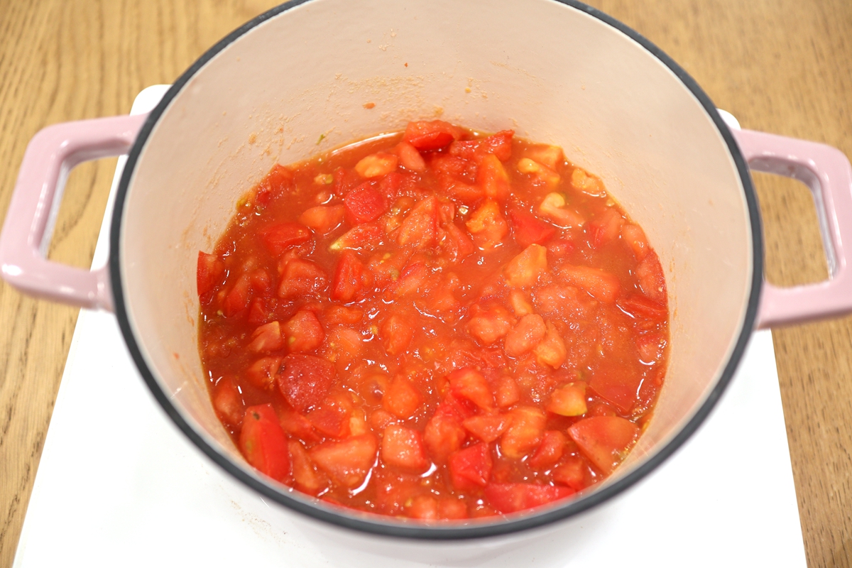 5.锅加热,倒少许橄榄油,将2/3入锅中翻炒,西红柿逐渐被加热变软出汤,一定要炒出红汤成糊糊状,这道牛腩汤才好吃;