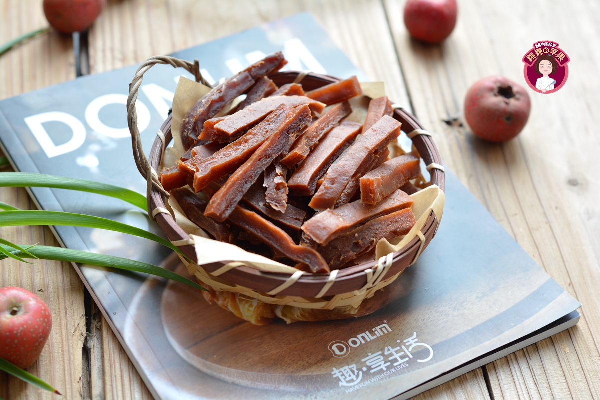 1. 这个山楂条的制作并不复杂,只是晾干或者烘干的时间比较长;摊薄一点晾干后卷起来就是果丹皮,这种厚一些的口感更加筋道;没有果干机或者烤箱,自然风干或者晾干也可以哒;