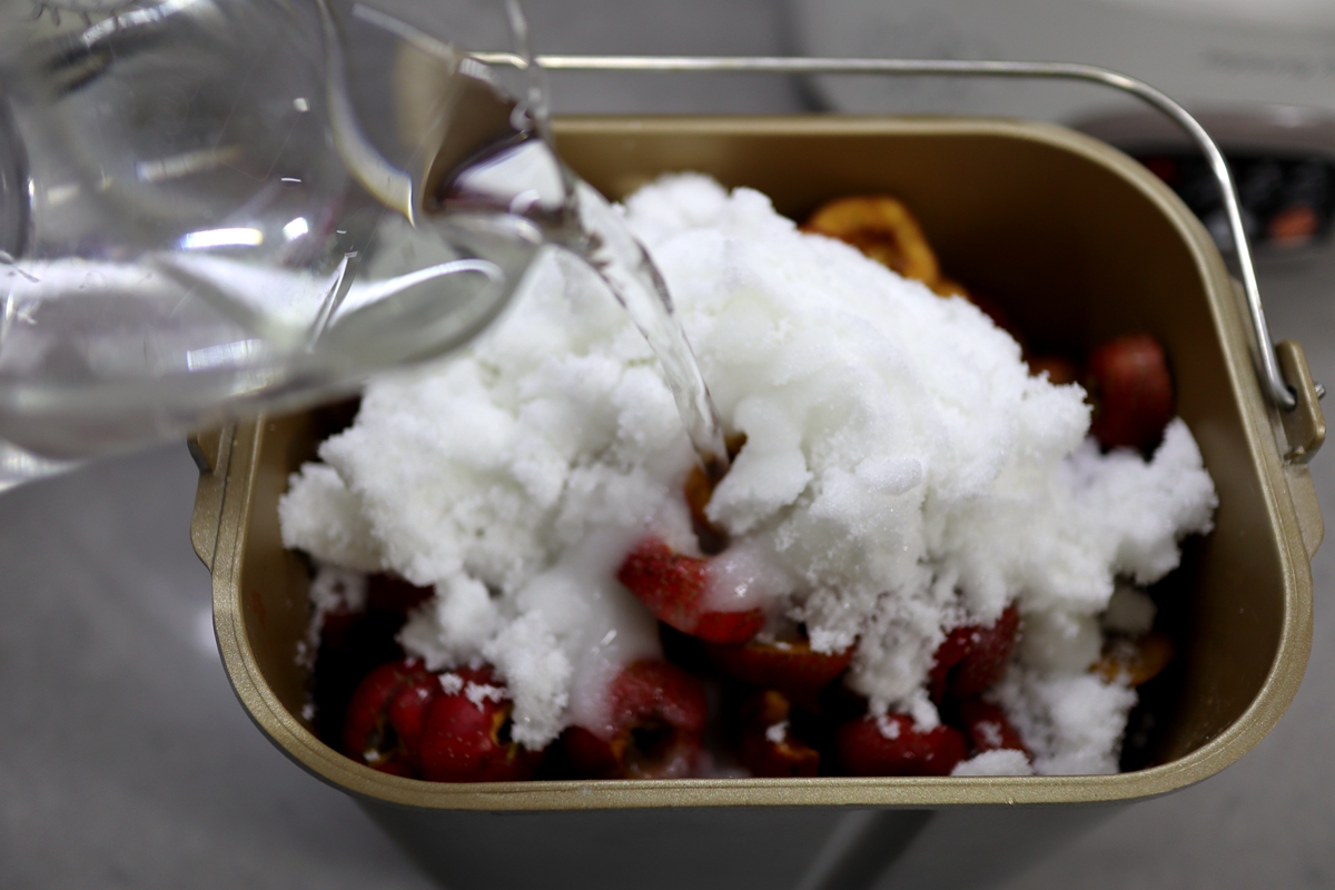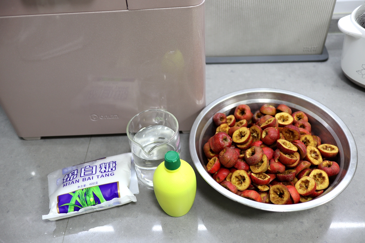 2. 山楂肉和白糖同入面包桶中,先倒500克凉水;