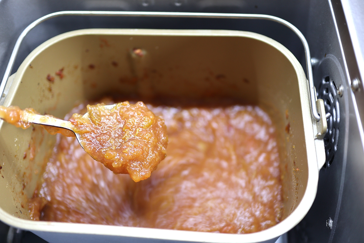 3. 把面包桶安放进面包机中,我用的东菱JD08面包机,有专门的“果酱”程序,默认时间1小时15分钟;没有面包机可以用具有加热功能的破壁料理机来操作,或者直接用煮锅炒锅都可以;