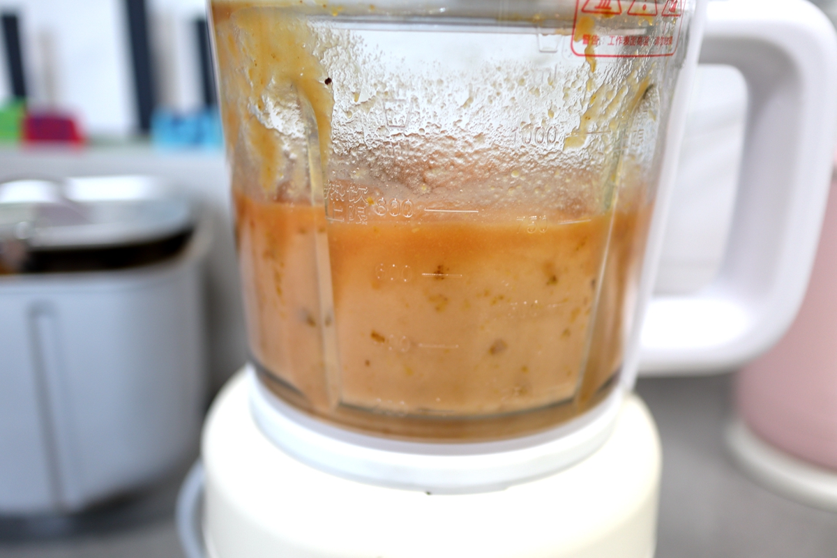 5. 山楂酱还不是太细腻,可以放进料理机中打成糊状,如果太粘稠,适量加些水,防止机器因超负荷工作造成损伤;