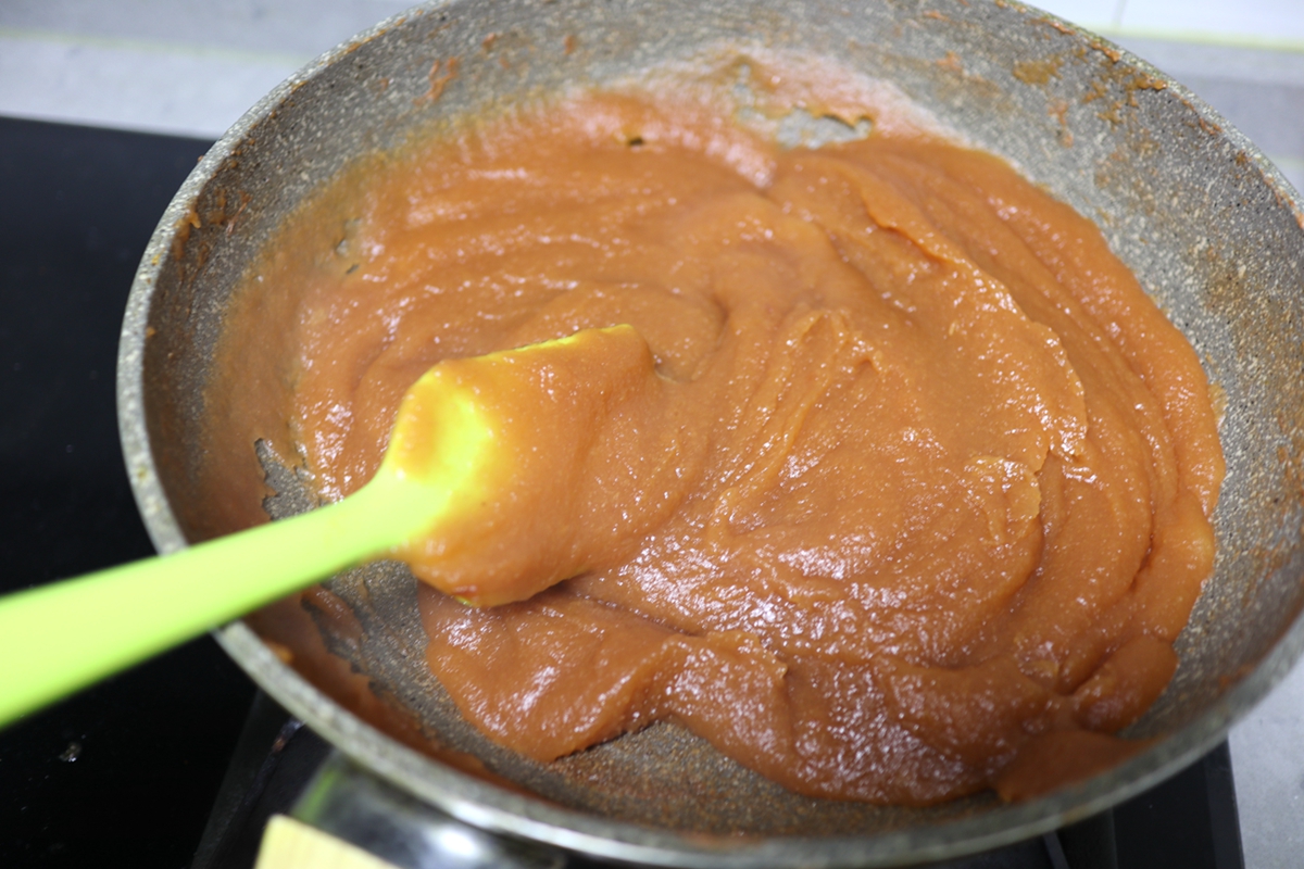 6. 打好的山楂糊入不粘炒锅中翻炒出多余的水份,多加此步可以使后面的成品用时短;