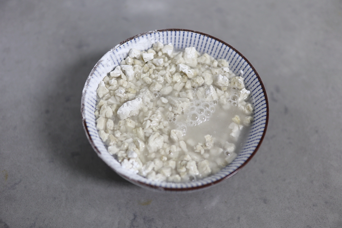 7. 准备一碗淀粉,用少量凉水将其泡软成浆状;