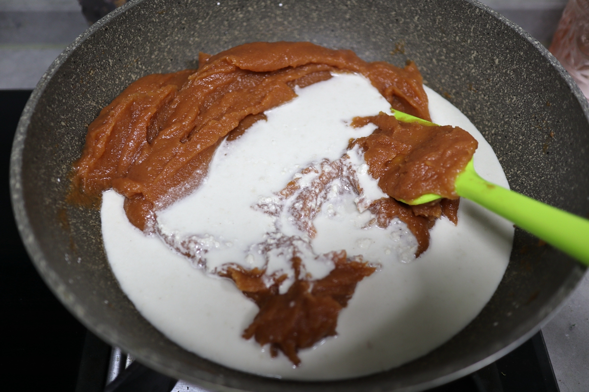 8. 山楂糊炒成酱后倒入淀粉浆,不停地搅拌;