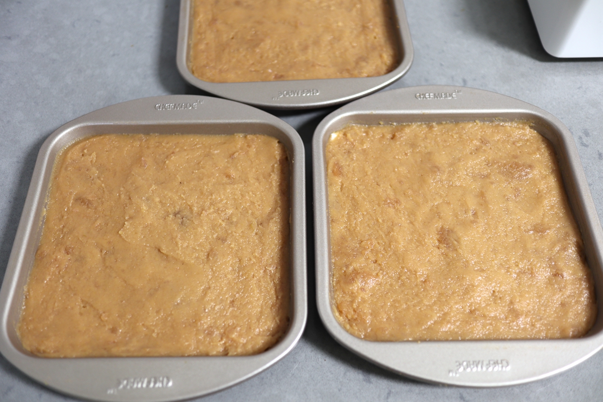 9. 因为加了淀粉浆,又增加了水量,所以山楂酱的颜色会变浅;准备几张不粘烤盘,没有烤盘用普通的平盘也可以,底部抹油或者铺一张油纸;我放的油纸,这样比较利于脱模;山楂酱的厚度8-10毫米,表面抹平;