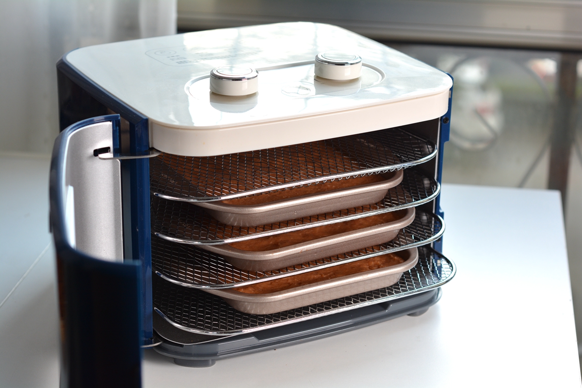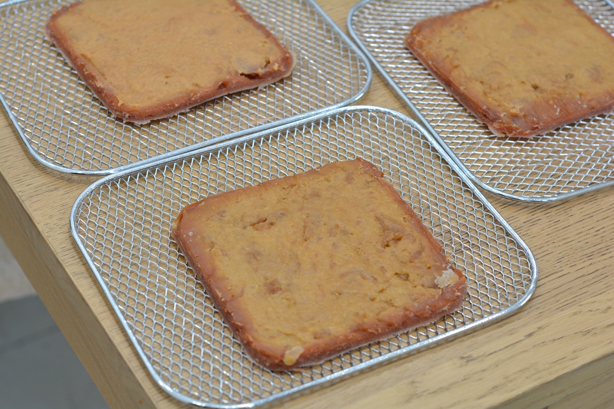 11. 待表面变干且能将整张山楂饼揭起来时,去掉油纸,翻面放在晾网上,再送入果干机中继续风干;