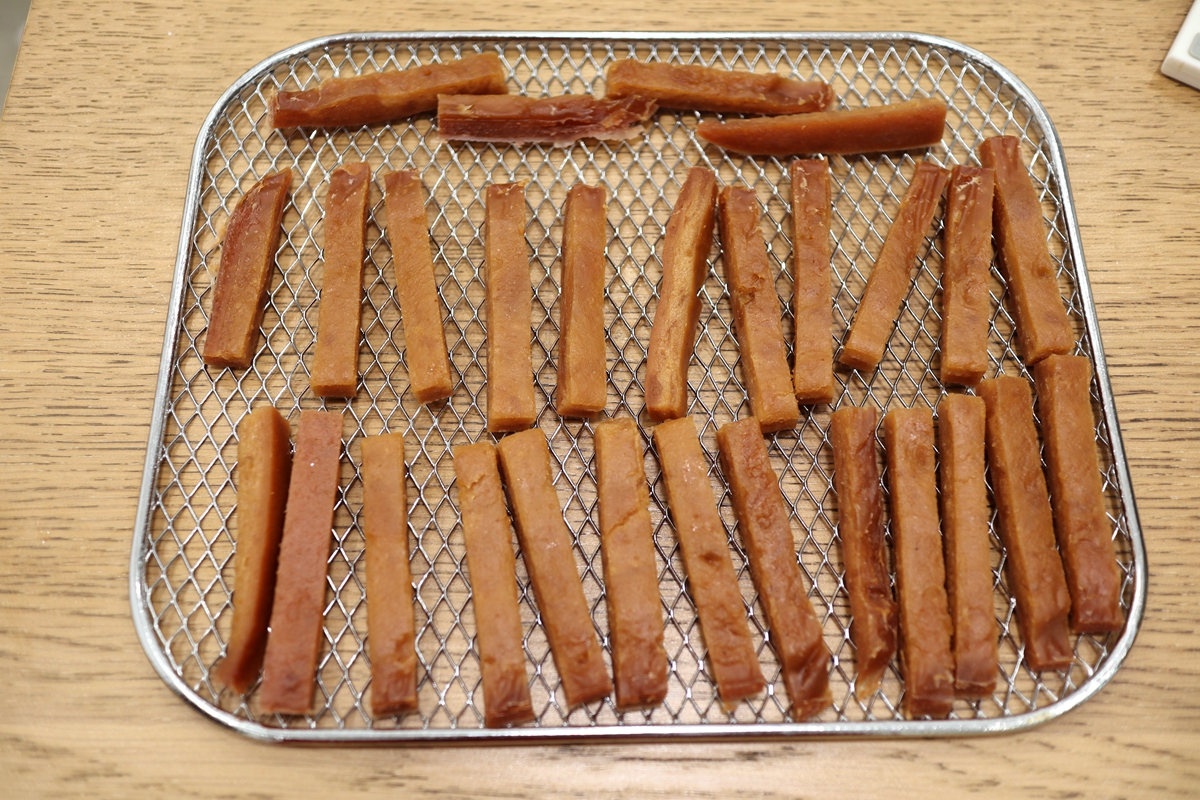 12. 待大部分水分蒸发,山楂饼成型且不软时,用利刀将其切成均匀的条状,再次放在晾网上,入果干机烘到自己喜欢的状态时,入罐或者入袋封存,随吃随取;或者室内自然风干。