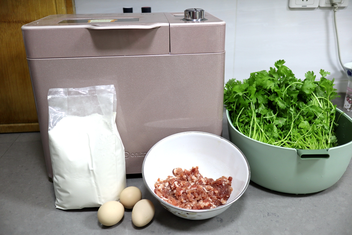 材料:高筋面粉500克,面粉用凉水320克左右,猪肉馅150克,鸡蛋3个,小芹菜1盆,植物油适量,盐适量,酱油少许,大葱1棵