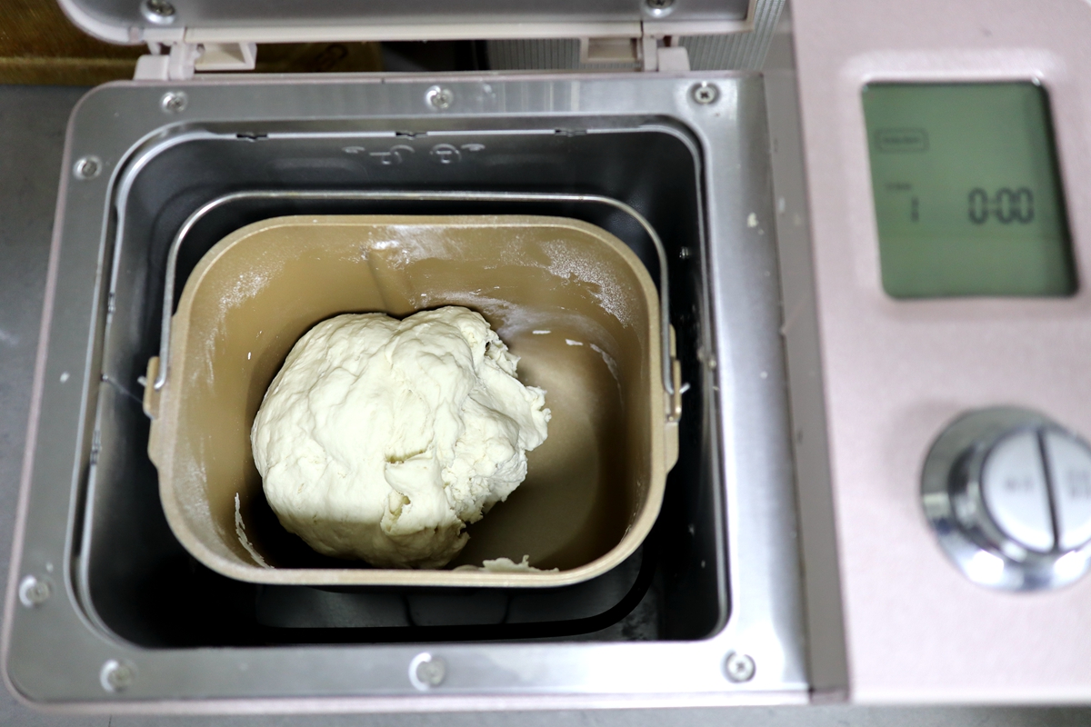2. 面粉和凉水入面包桶中,面粉的吸水率不同,所以水量可以逐量加入;我用的面粉吸水性较好,所以水量在60-65%之间,面包机是东菱JD08,有专门的揉面档,10分钟揉好面团放在桶里盖上盖子,饧30分钟以上再使用,面团柔软而滋润;