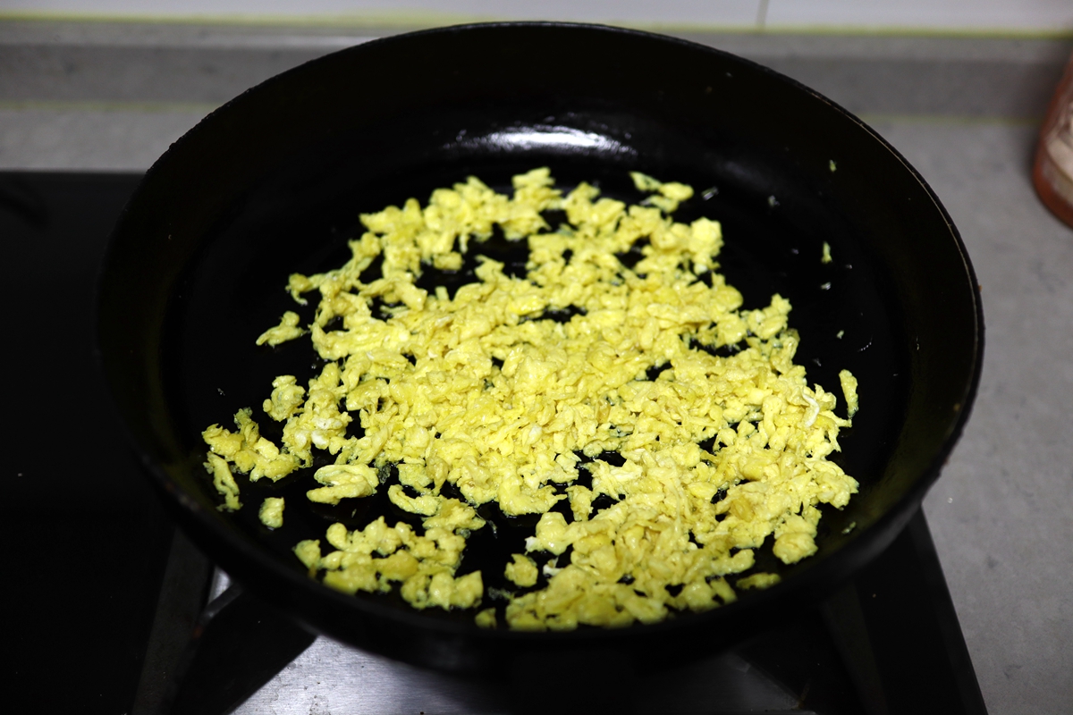 3. 饧面的时候来处理一下馅料:鸡蛋入碗中打散,炒锅中倒适量油,手放在油锅上方10公分处,感到有微微热气时将鸡蛋液倒入锅中,用筷子不断搅拌,随着温度不断上升,鸡蛋液凝固并且被筷子搅成了均匀的小块,关火,晾凉后使用;
