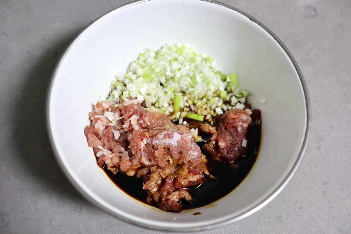 4. 猪肉馅中倒入大葱末、适量盐、酱油;酱油品牌不一样,颜色和咸度也不一样,个人的口味不同,所以盐和酱油酌情加入;