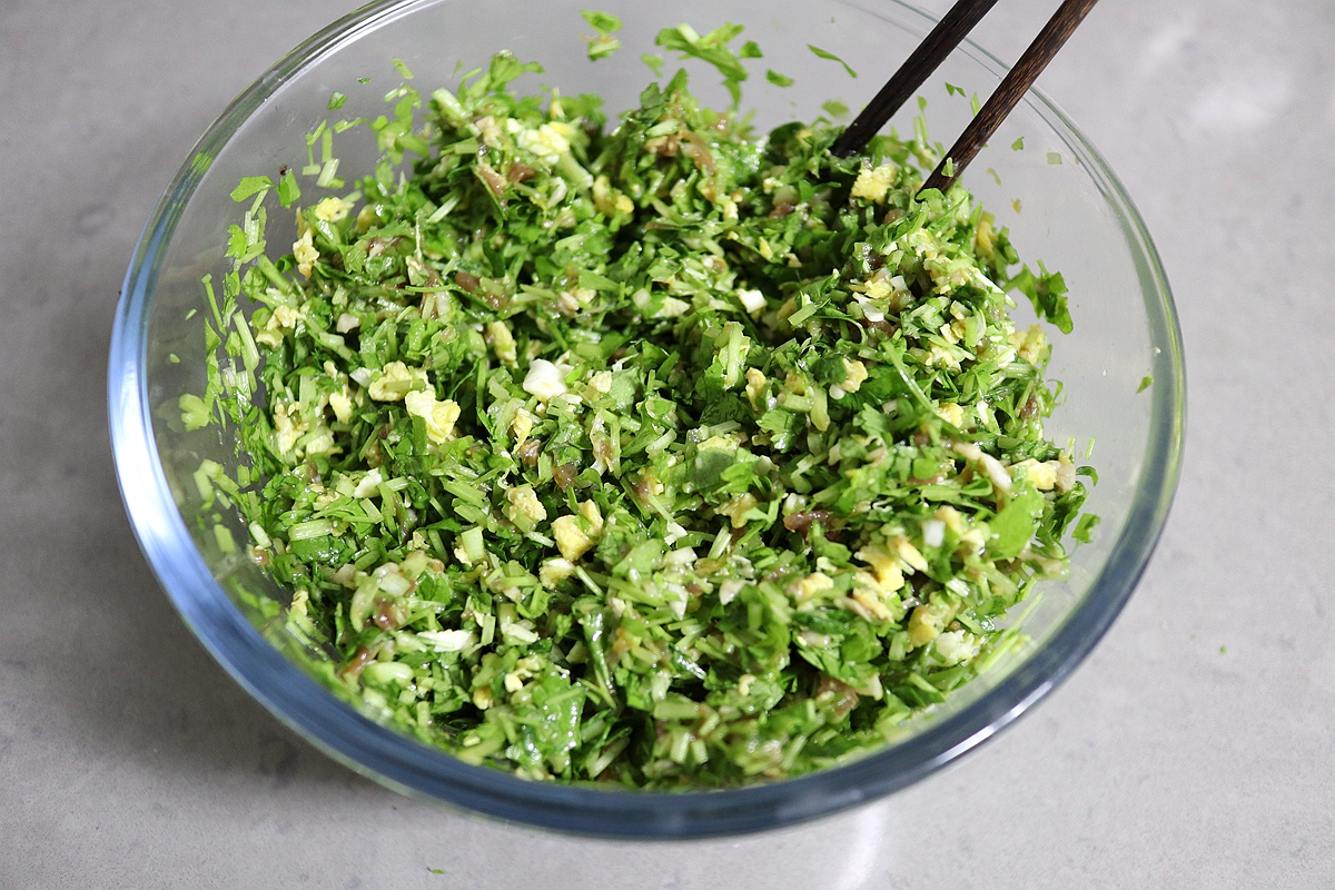 6. 芹菜要碎末,与晾凉的鸡蛋碎同入肉馅中,搅拌均匀,不用担心馅料出汤,前面说了,肉馅中打入的水极少,足可以将芹菜汁吸进来;
