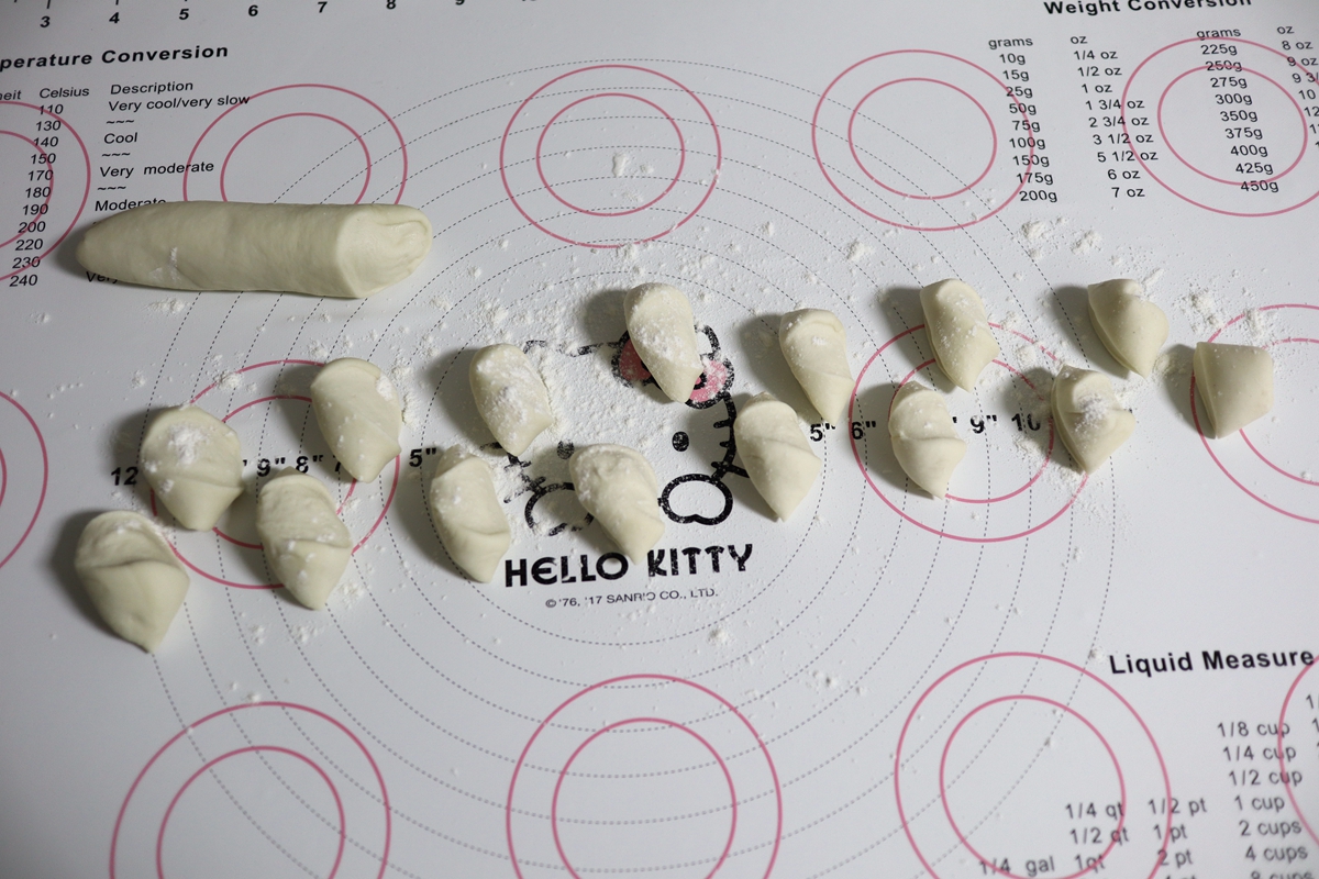7. 饧好的面团取出放在揉面垫上,搓成细长条,再切成大小均匀的剂子,大小随自己的喜好;