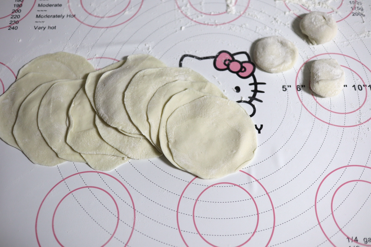 8. 把剂子擀成周围稍薄、中间略厚的小圆皮;擀的时候撒点面粉防粘;