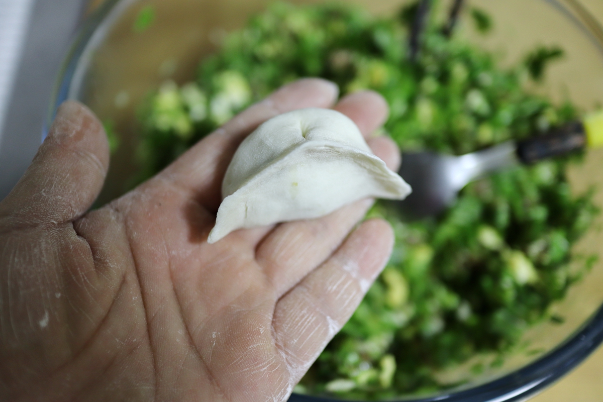 9. 取适量馅料放在圆皮上,按自己的手法或包或捏或挤成饺子;我的饺子只需三步:放馅,皮子中间对捏,双手同时将两边捏挤严实。前后不到3秒,齐活;