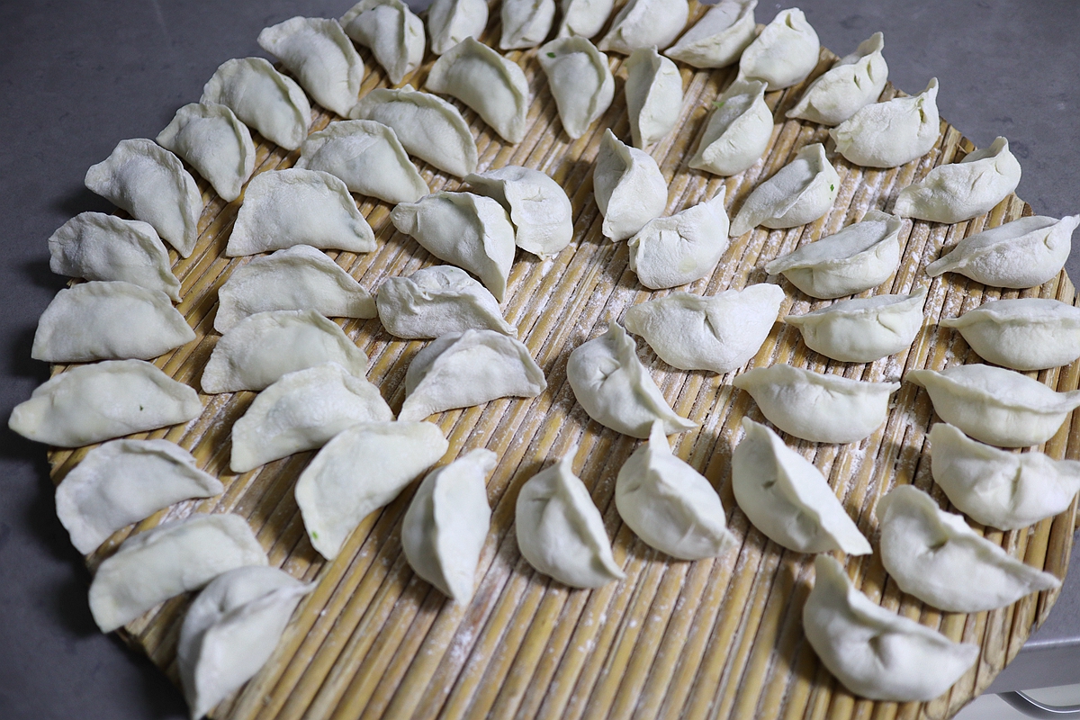 10. 包好了,3人吃刚刚好;快包完时烧一锅水,这边包好了,那边就把饺子下锅煮,煮到饺子肚子胀鼓鼓就捞出来,这么鲜美的芹菜馅料饺子不建议放醋,会把独特的芹菜香叶给遮盖住。想吃辣的可以蘸食辣椒油,倍儿棒!