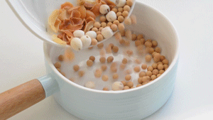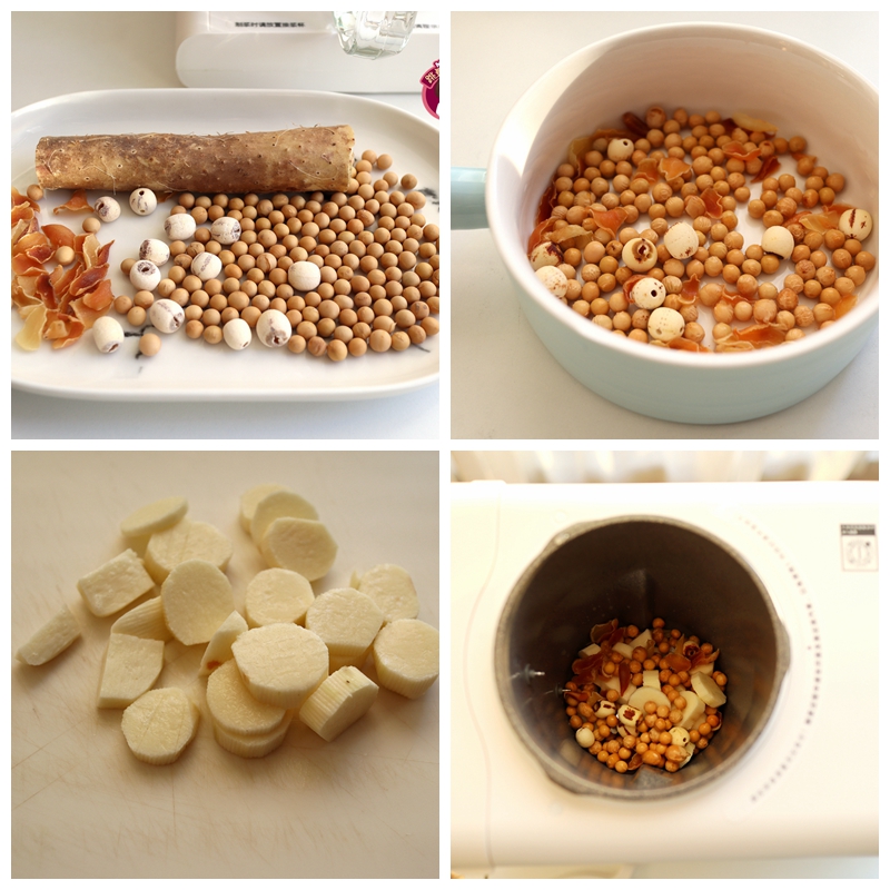 材料:新鲜山药1段,莲子12颗,干黄豆25克,百合10克,清水800毫升