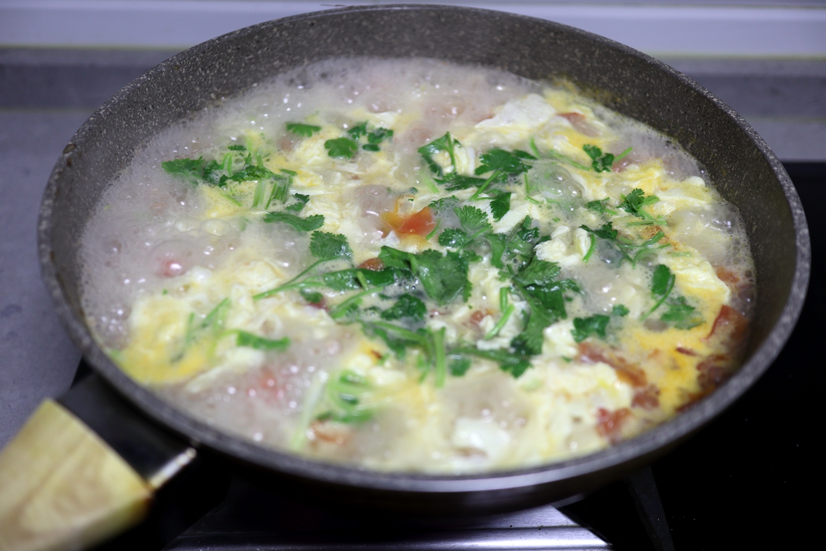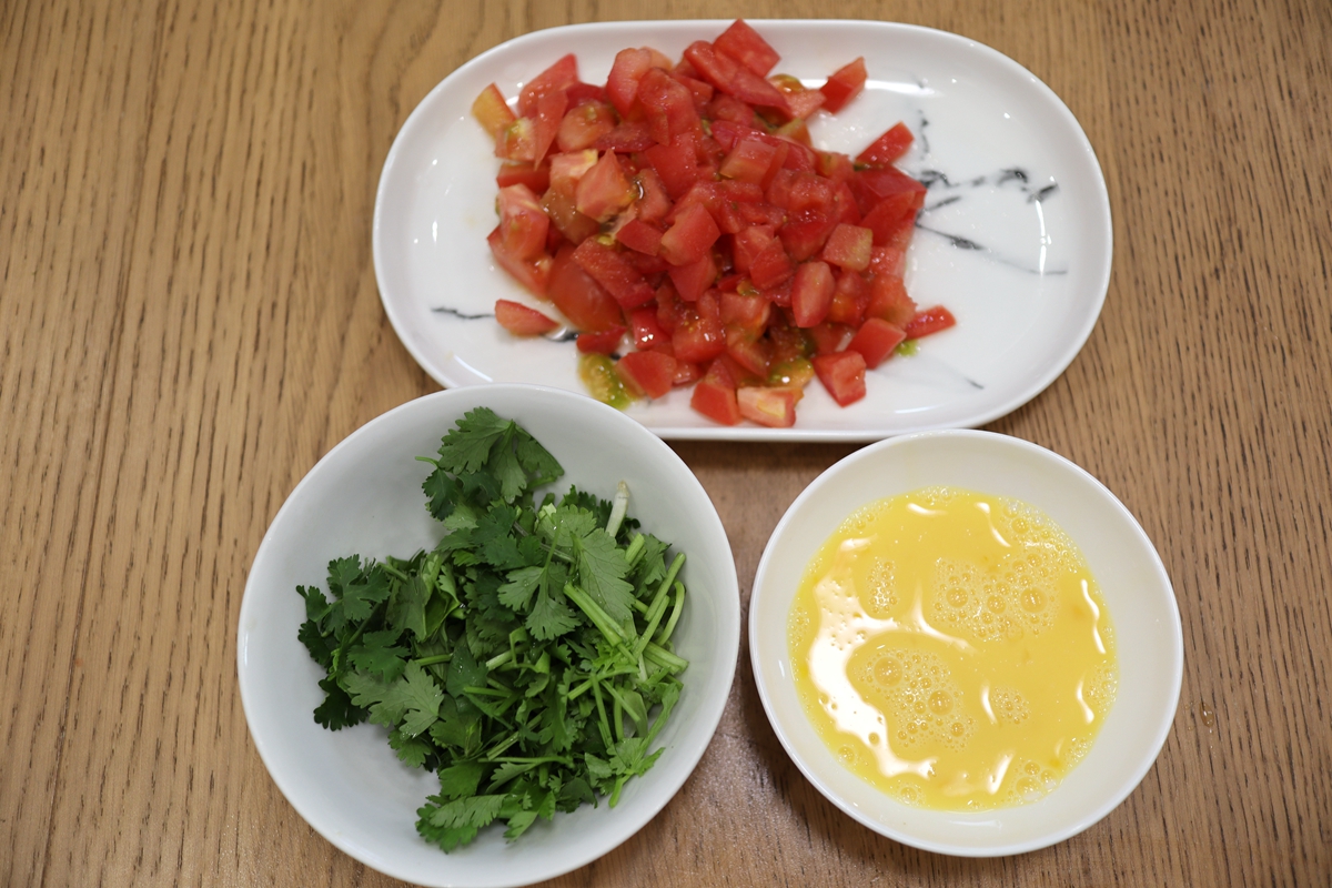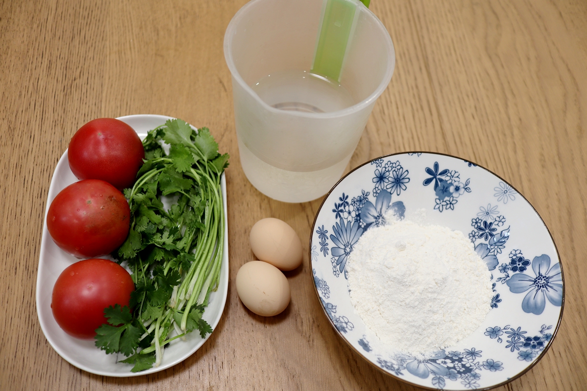 材料:面粉200克,水适量,西红柿3个,鸡蛋2个,香菜3棵,油少许,盐少许,生抽少许,辣椒油适量