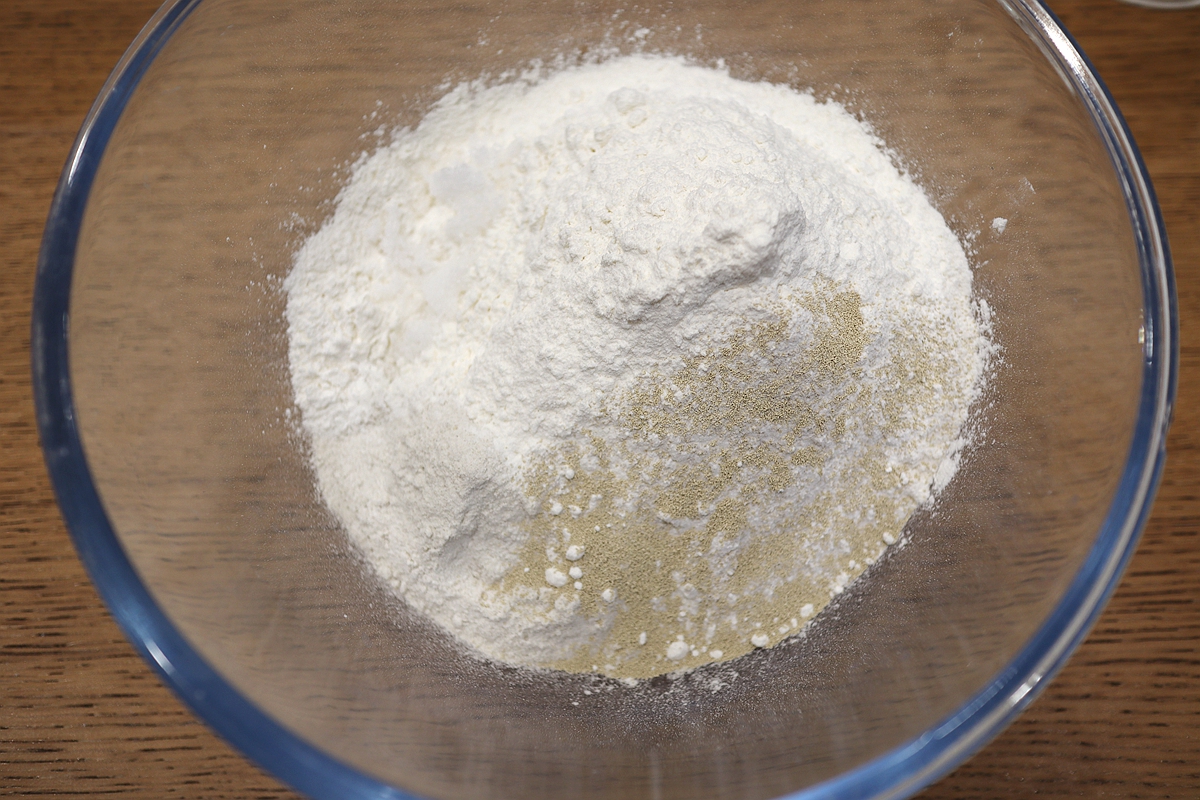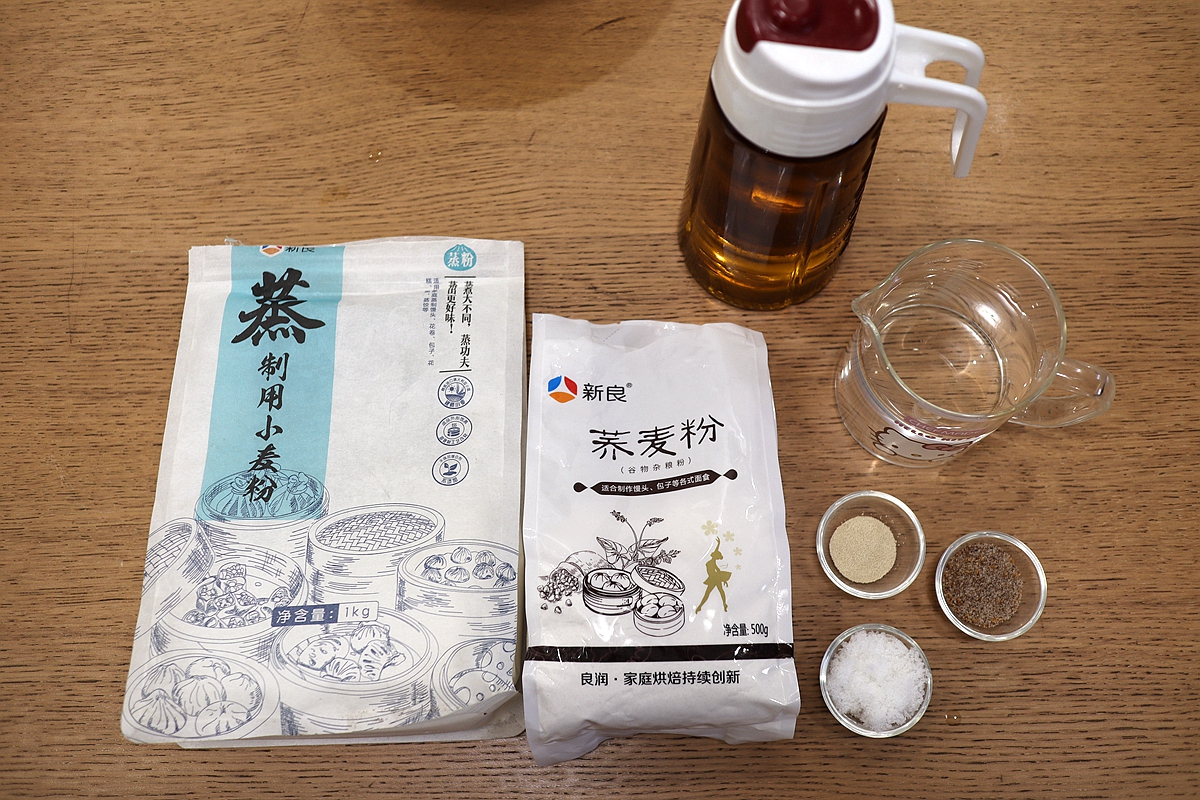 材料:小麦面粉300克,荞麦粉100克,干酵母5克,白糖10克,温水240克,椒盐10克,油适量