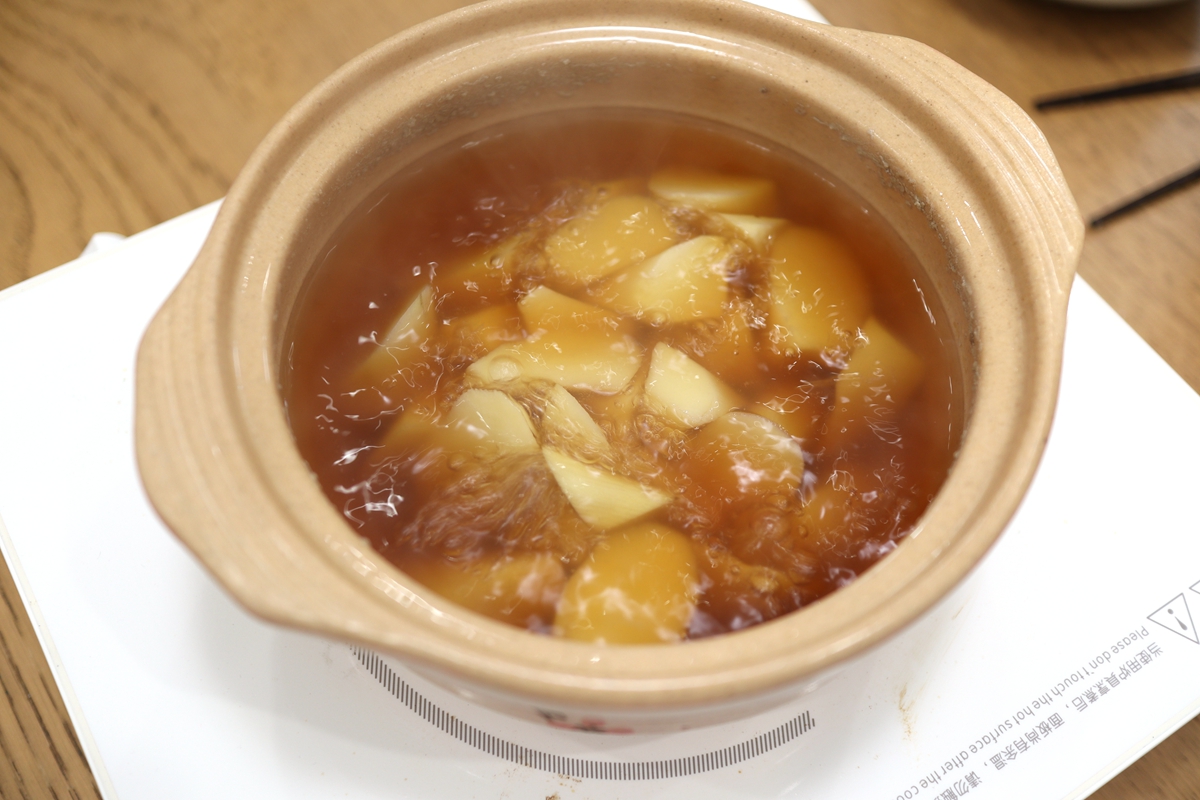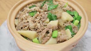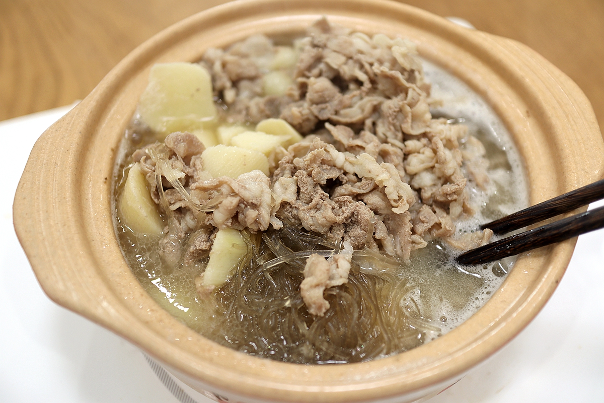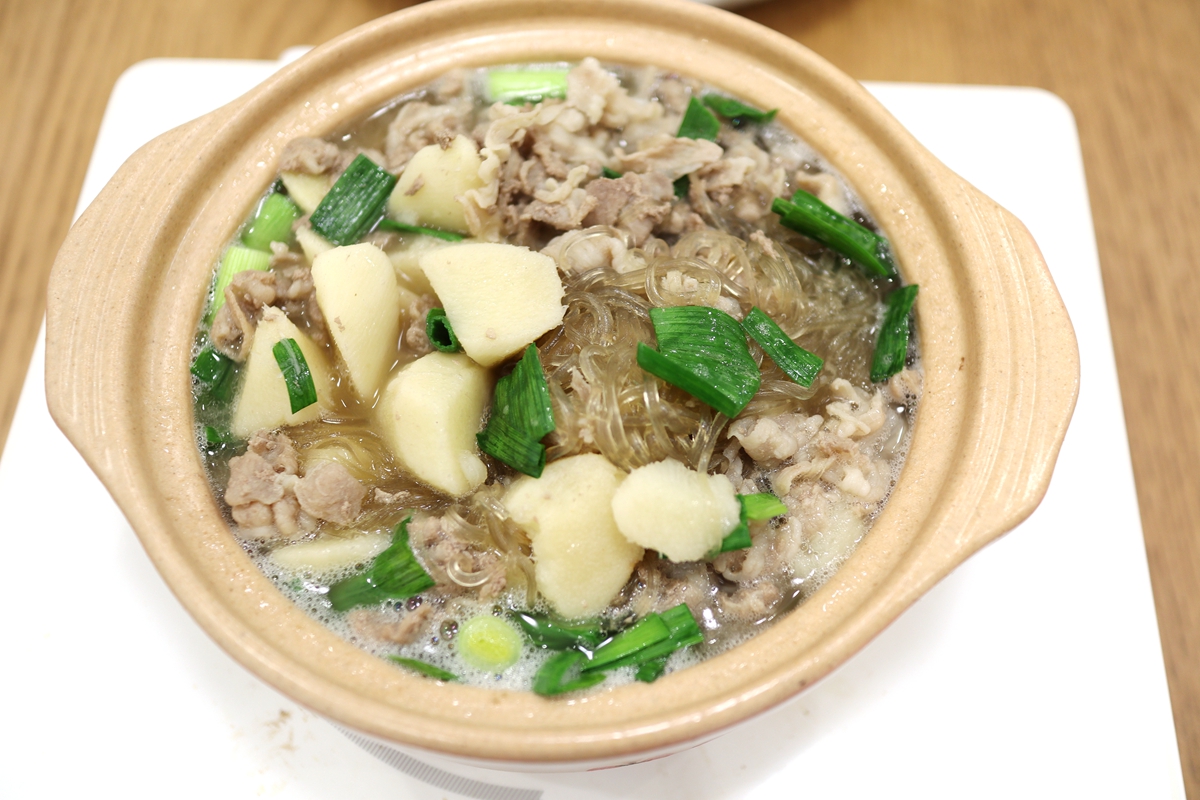 红薯是很好的低脂肪、低热能食品,每100克鲜红薯仅含0.2克脂肪,产生99千卡热能,大概为大米三分之一。在这道山药羊肉煲中放一把红薯粉丝,获得碳水化合物的同时,还有润肠、通便的效果;且红薯粉丝吸足了汤汁,柔软而味鲜。
