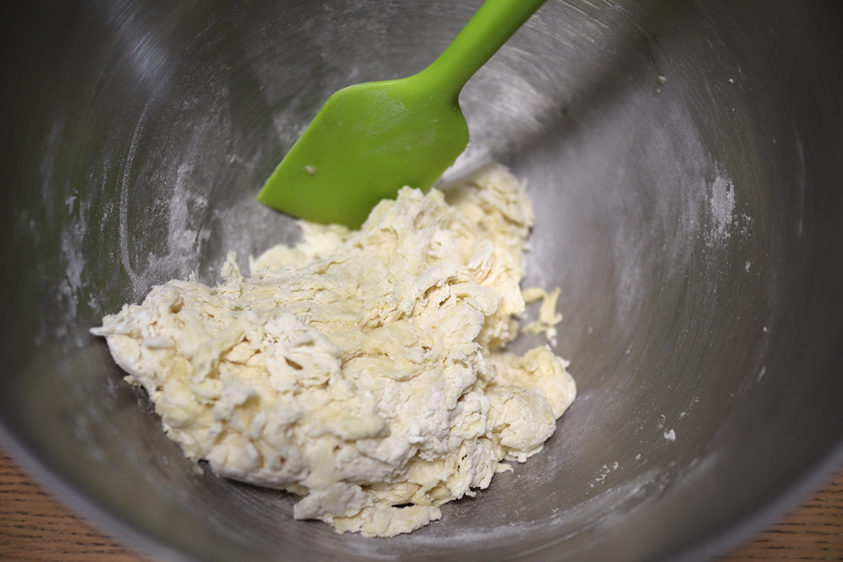 2. 除盐和黄油之外的所有材料入揉面桶中,先用刮刀将材料大致混合成团;