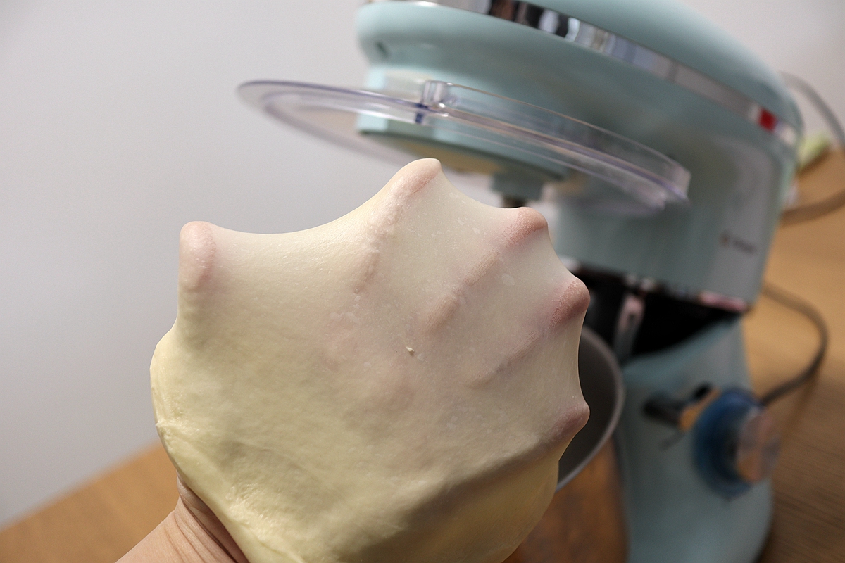 4. 面团柔软、滋润、细腻、有弹性且不粘盆壁,揪一块面团轻轻撑出手套膜,戳个洞,洞口有小锯齿状,做小面包是完全可以的;