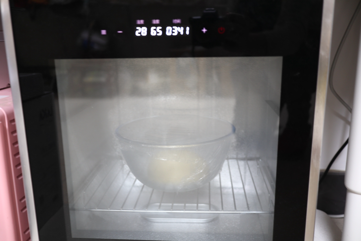 5. 面团收圆,放在深盆里,蒙上保鲜膜放在温暖湿润处进行基础发酵,如果放在发酵箱内,温度设为28摄氏度,湿度65%,时间2-3小时,主要是看面团的状态来决定;