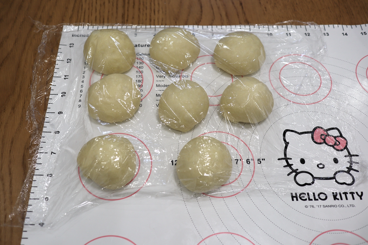 7. 面团放在揉面垫上,轻轻拍打排气,称重分成8等份,揉圆后蒙保鲜膜,松弛20分钟左右,面团用手指按压不回弹就是松弛够了,如果回弹,说明松弛的时间还不够;