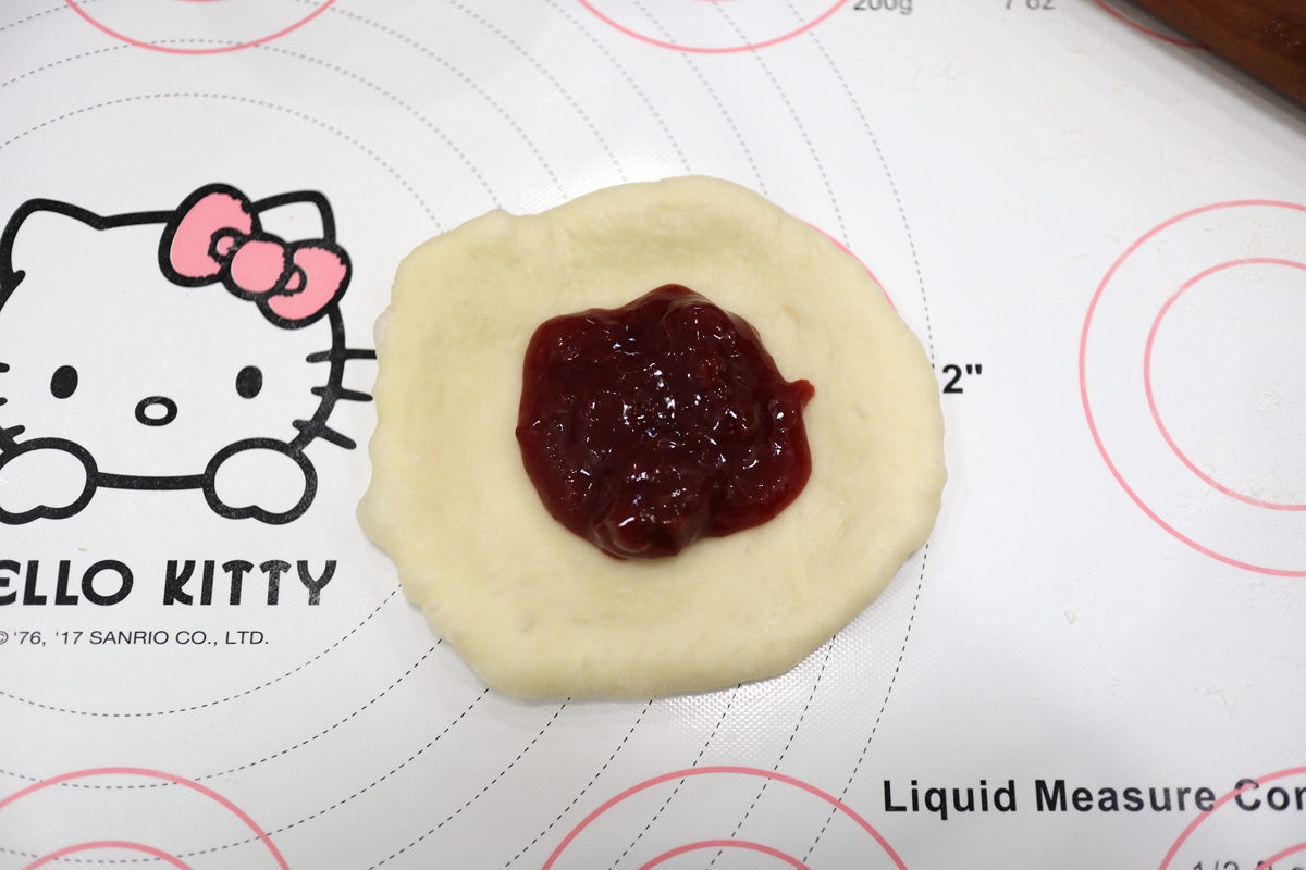 8. 取一个小面团,擀成小饼状,舀适量果酱放在上面;
