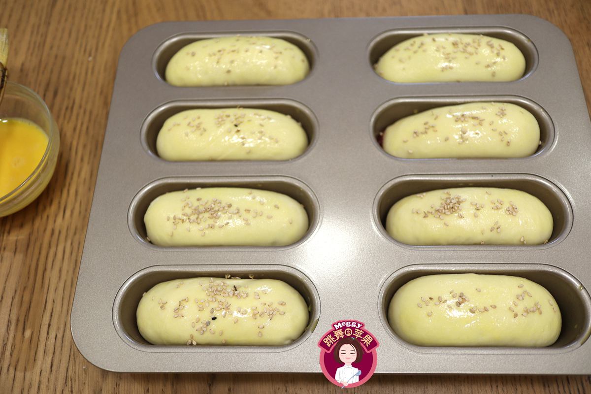 11. 面团是原来的1.5-2倍大小时,烤箱开始预热180度;面包生坯表面刷蛋液,撒少许白芝麻;