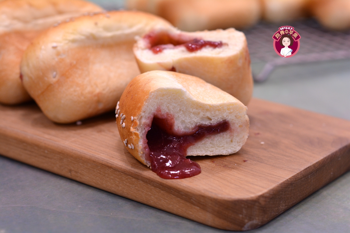 【材料】高筋面粉300克,耐高糖干酵母3克,盐3克,细砂糖50克,鸡蛋50克,冰水150克,黄油30克,表面刷蛋液少许,表面撒白芝麻少许,内裹(冠利果蔬)果酱适量