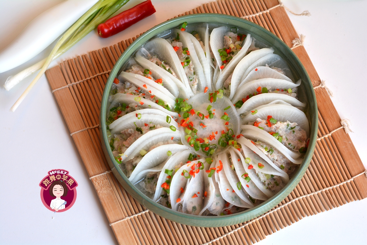 今天的萝卜吃法特别受小朋友喜欢,没有酱油的掺和看着清清爽爽,放了一点儿肉馅而又鲜美香嫩。上锅蒸8分钟,不用加一丝油,少了油烟的侵扰,真是一举多得的好菜。