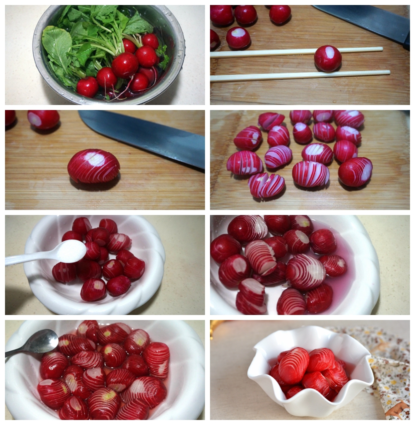 2. 刀功差的,可以取两根筷子,夹住樱桃萝卜,这样切的时候不会将底部切断;