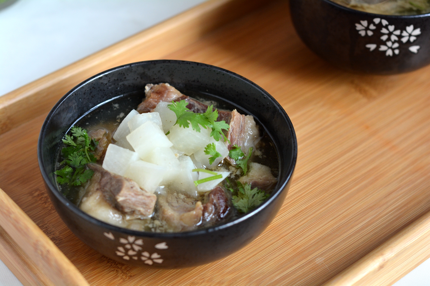 材料:脊骨500克,白萝卜1根,酱油适量,料酒少许,大葱半根、花椒一撮,八角2颗,水适量,香菜少许