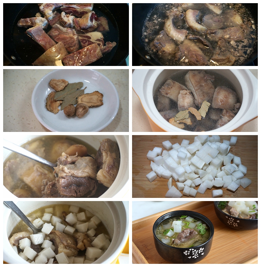 材料:羊肉1000克,白萝卜小半根,当归两片,白芷一片,白蔻两粒,香叶两片,盐