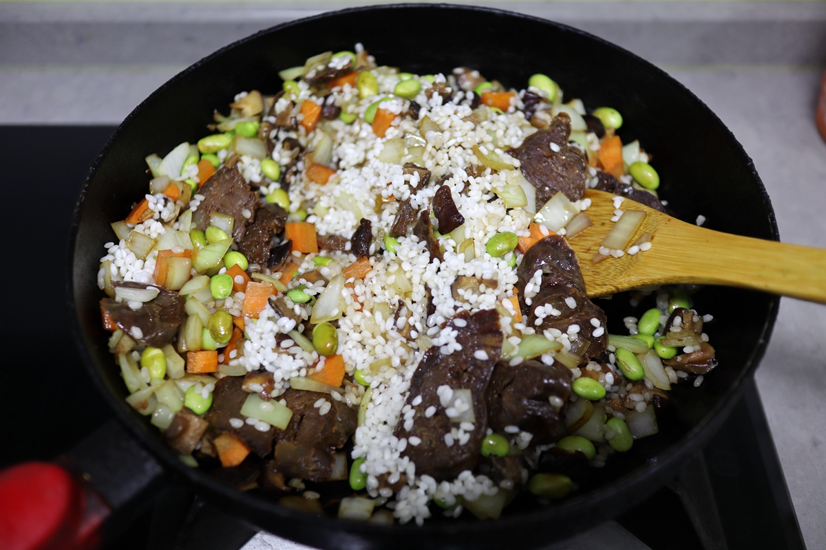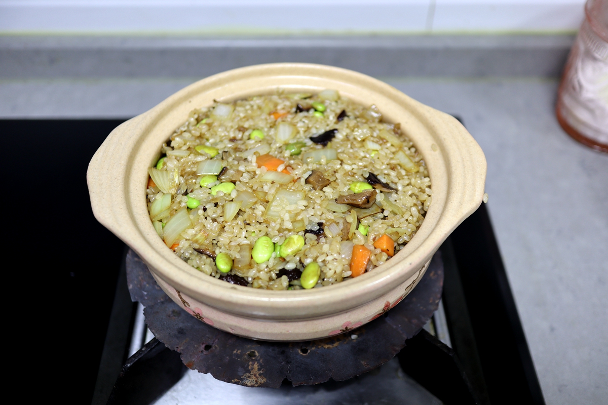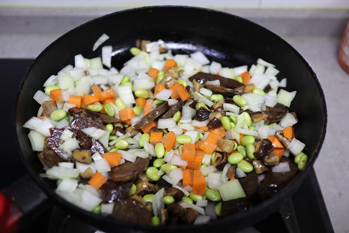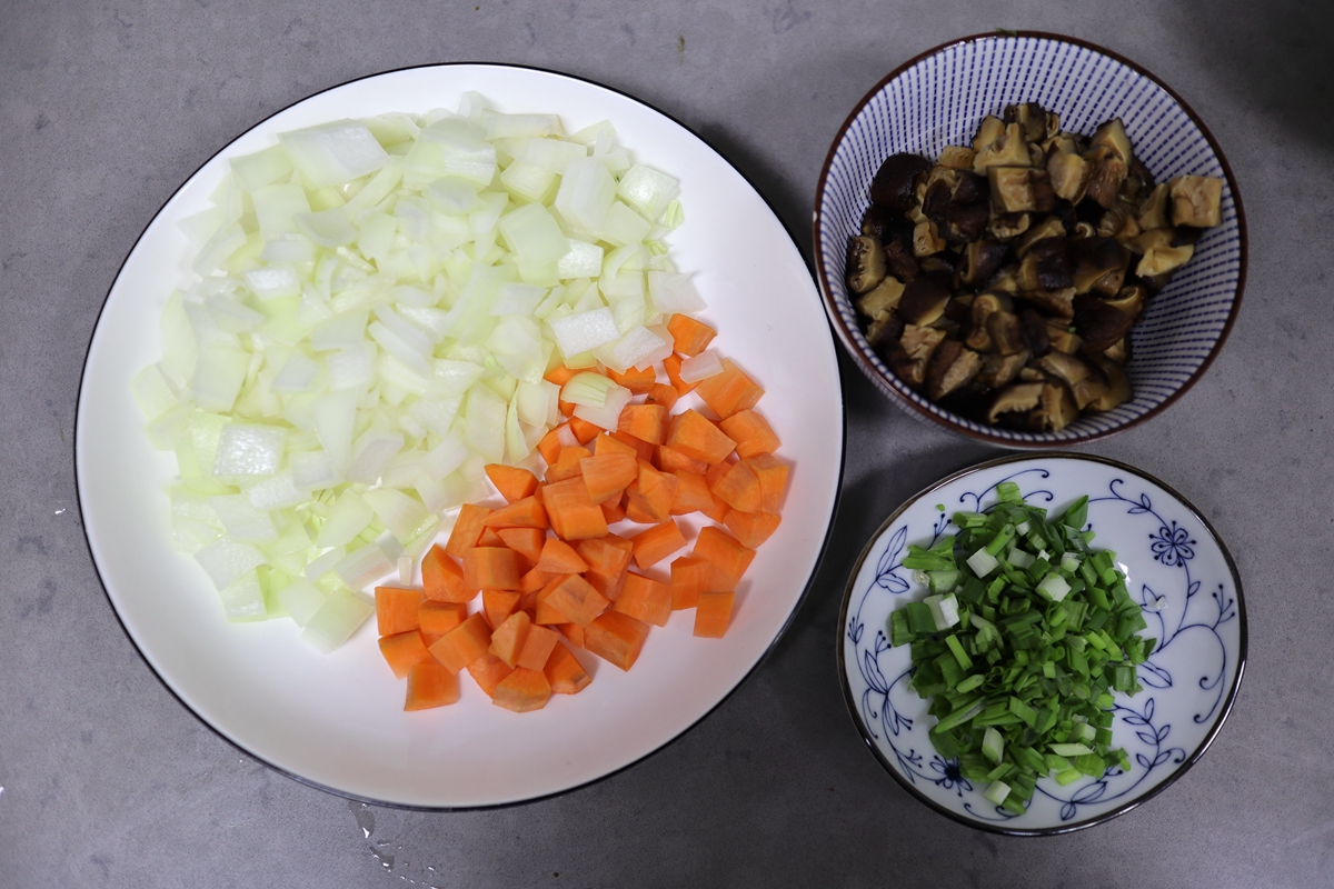 【配料】腊肠2根,干香菇1碗,洋葱半个,青豆半碗,胡萝卜半根