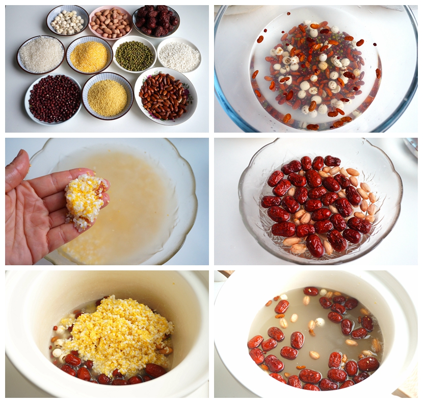 5. 将泡发好的豆类红枣等物再重新清洗一遍,与米类同入煲锅中;