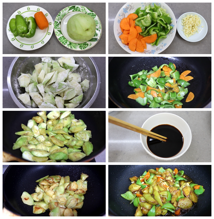 材料:圆茄子1个,青椒1个,胡萝卜半根,普通面粉50克,植物油适量,盐少许,酱油30克,蚝油15克,凉水50克,大蒜5瓣