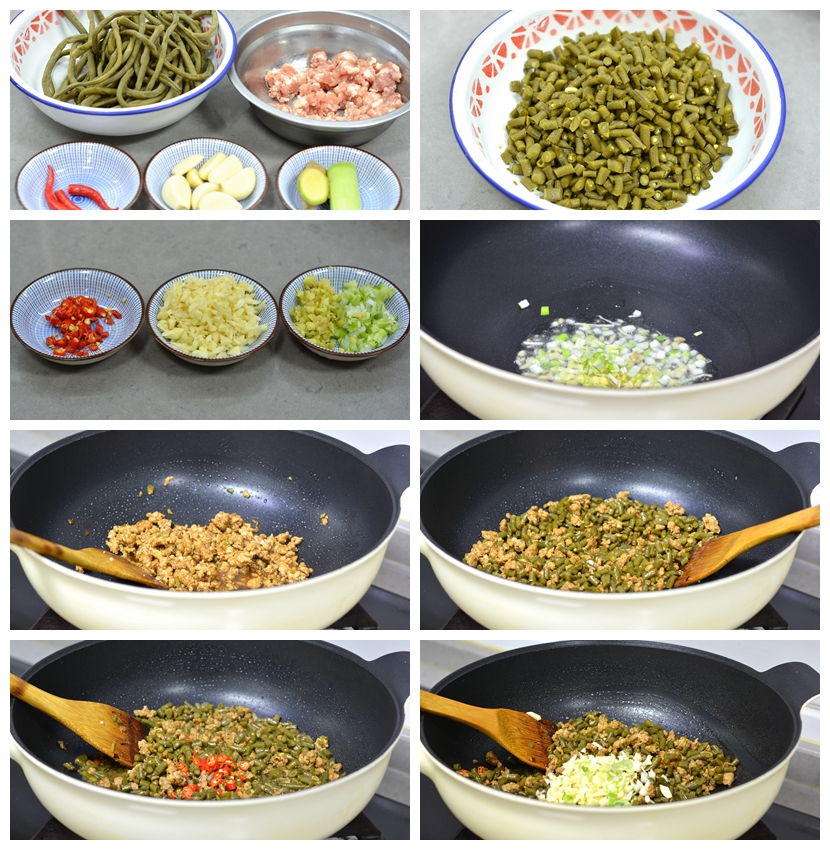 1. 酸豇豆冲洗一下即可,肉馅肥瘦相间,干红辣椒随喜好增减;大蒜必不可少,姜葱炝锅用;