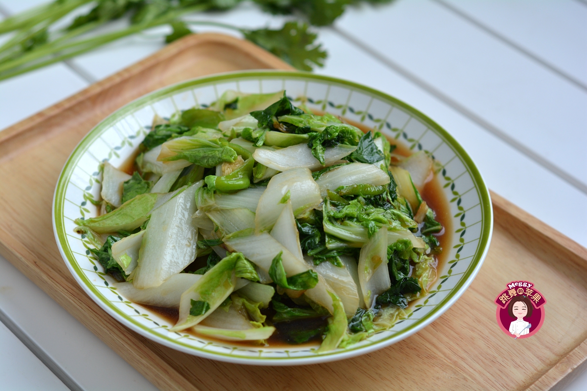 6. 撒少许盐,再倒少许蚝油,将白菜炒得有一点点塌软,关火装盘。