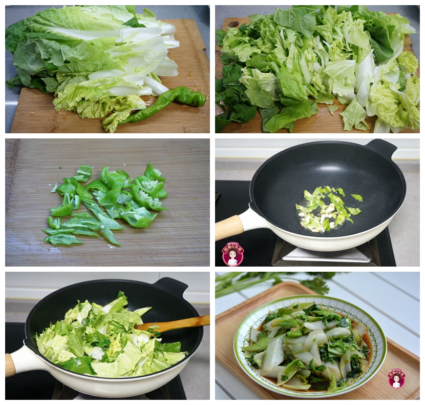 材料:奶油白菜2棵,螺丝辣椒1根,油少许,葱花少许,盐适量,蚝油少许