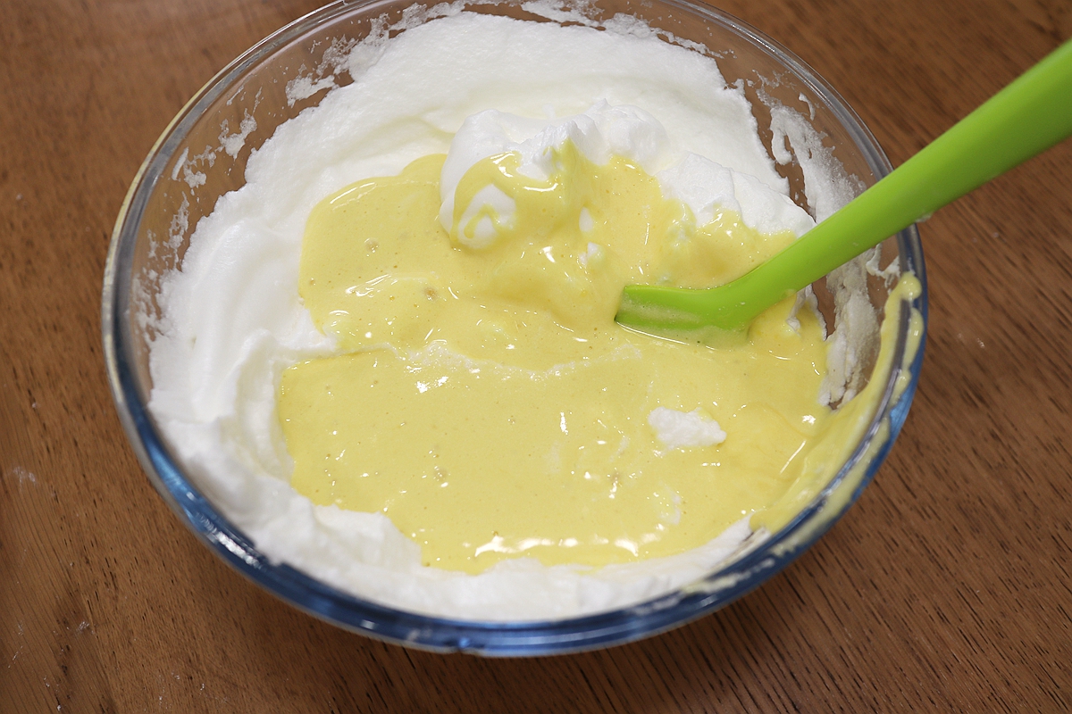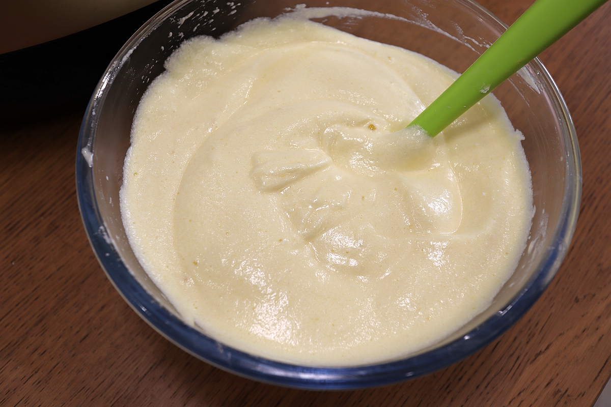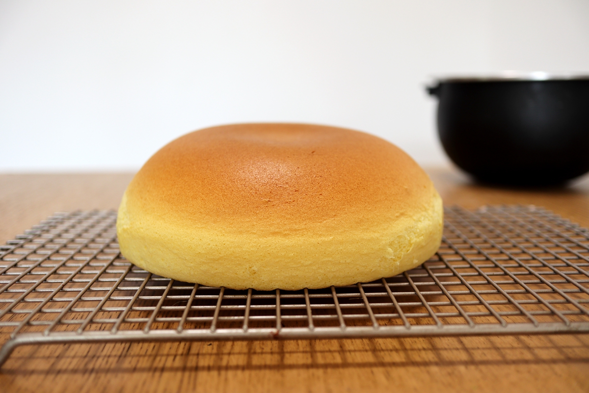 所有的操作手法跟烤箱版的戚风蛋糕别无二致,从涨发的高度,到组织的细腻程度,除了形状上有差别,口感上略湿润一些,还真挑不出啥来。