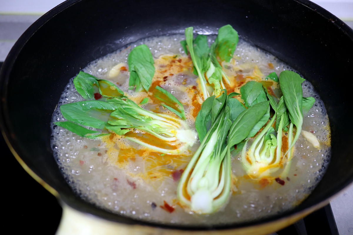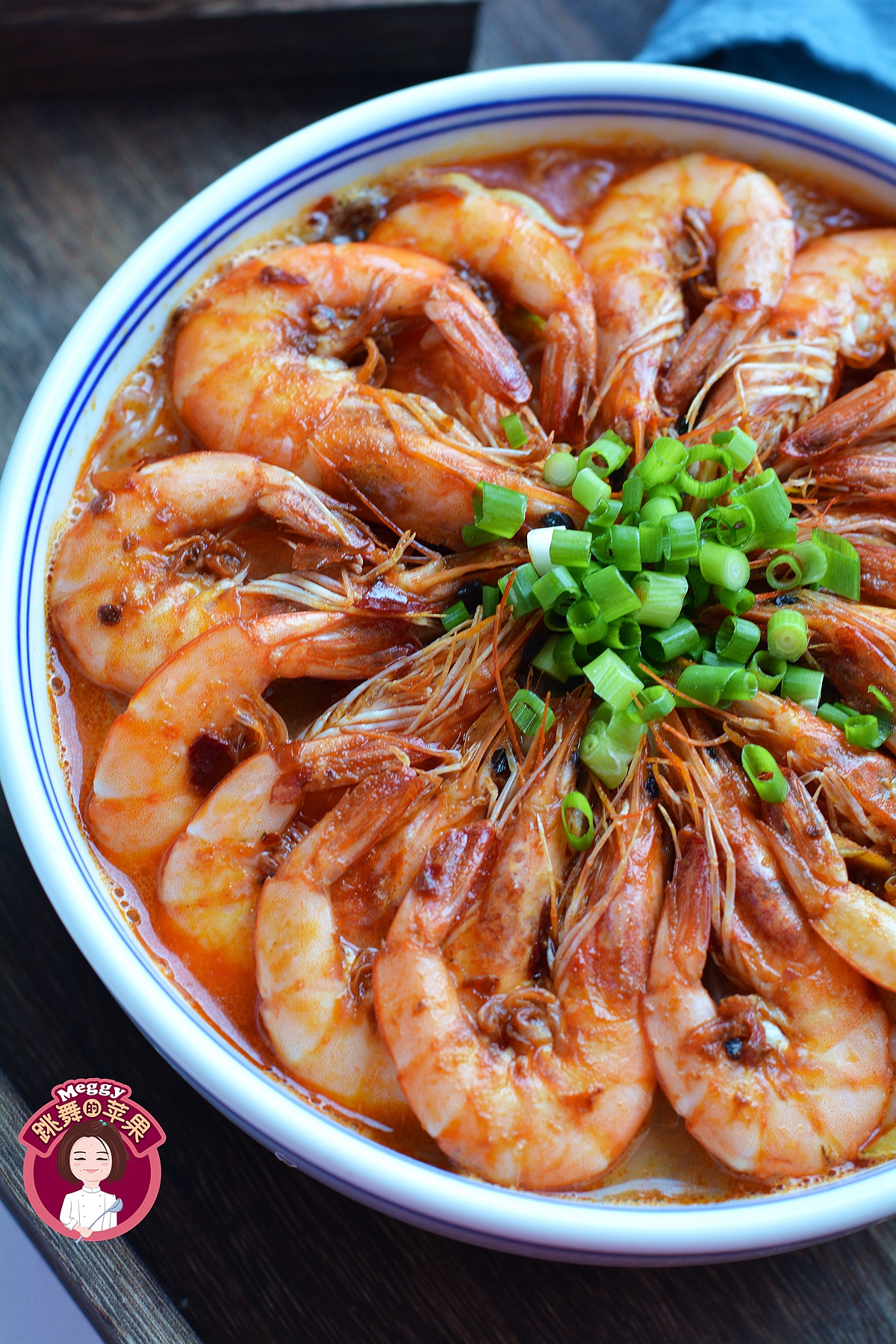 没有汤也不要紧,可以把虾炝炒完之后直接水煮,虾本身富含蛋白质、氨基酸,煮两分钟鲜味也能渗透在汤里,照样倍儿鲜。只是摆盘的时候需要花点时间从纷纷扰扰的粉丝中挑出来。但如果自家食用也不招待客人,大虾粉丝青菜一锅烩,红的绿的白的,看着还热闹呢。