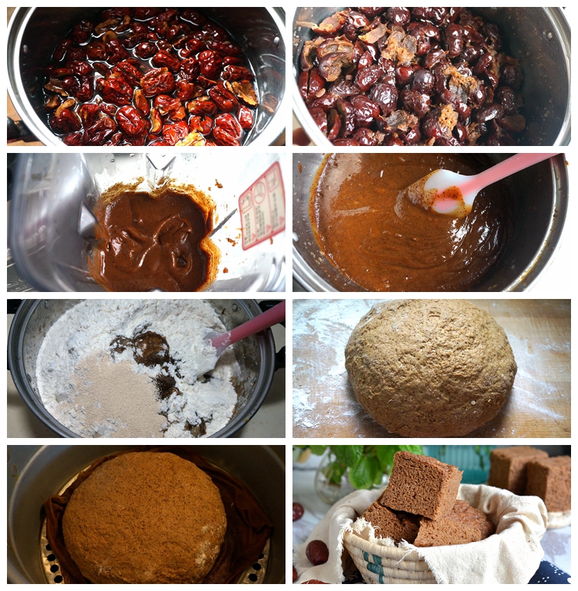 红枣煮熟,再用料理机打成红枣糊,用枣糊直接和面,蒸好的红枣发糕枣香浓郁,口感暄软而筋道。