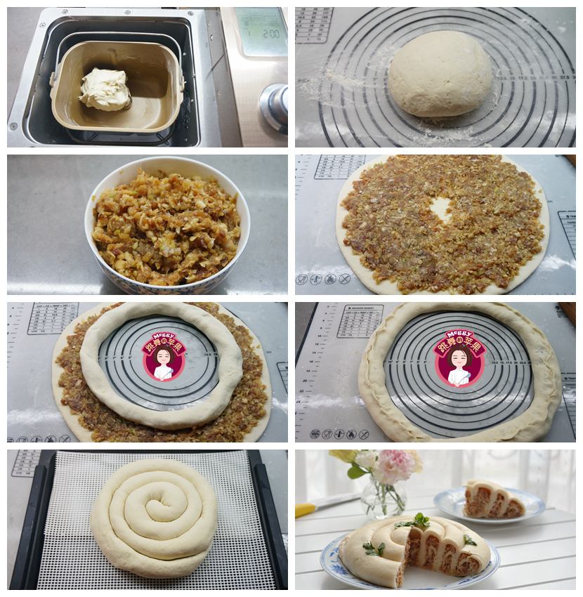 4. 将面团擀成厚约5毫米的圆片,肉包均匀地铺抹在面片上,中间留一小块空白,边缘留1公分空白;