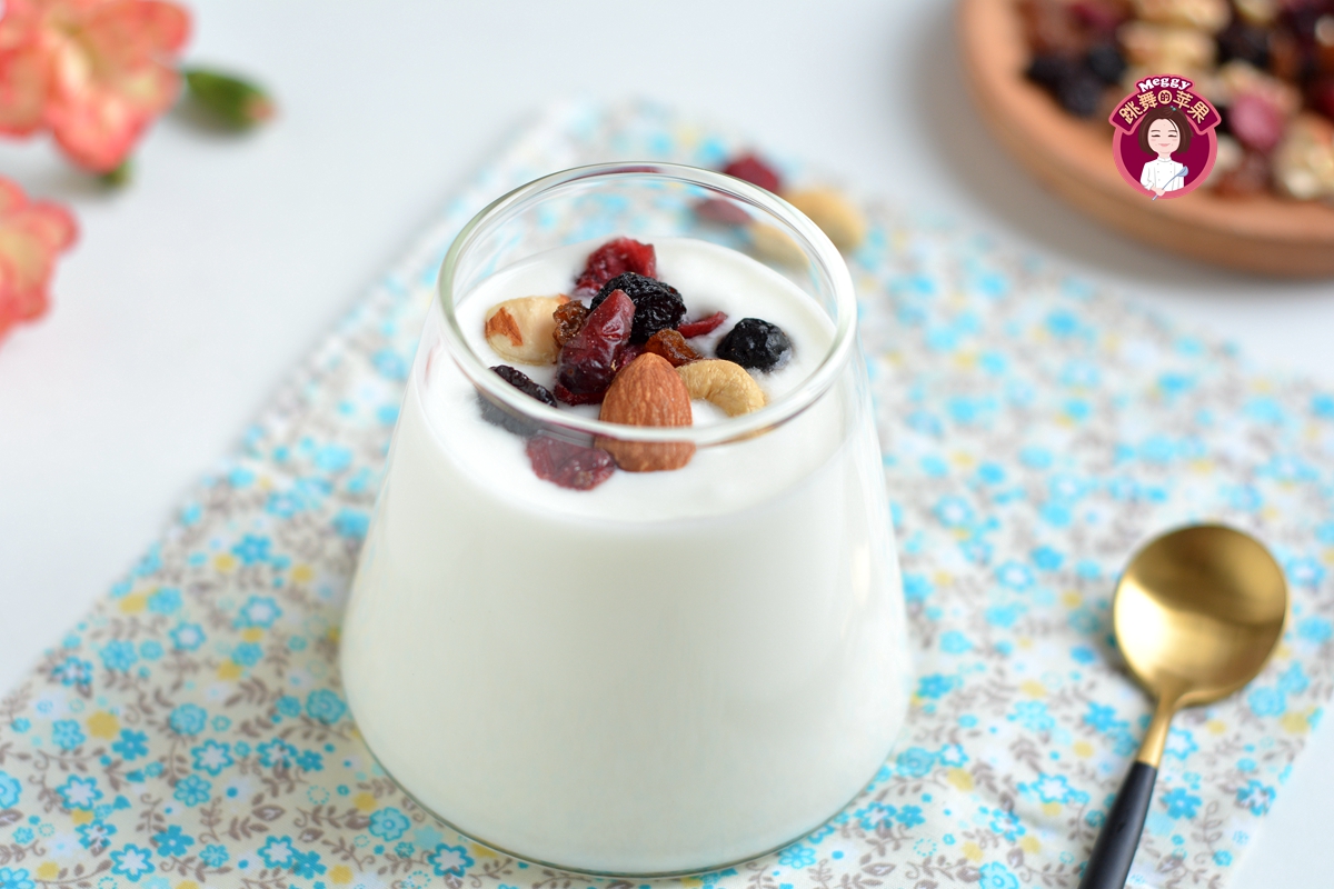 酸奶中加入了干果果仁水果干,所以不需加蜂蜜,边喝边嚼,越喝越香。