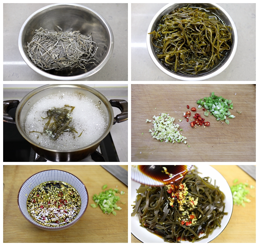 【材料】海带丝,香醋、生抽、盐、小米辣、大蒜、香葱