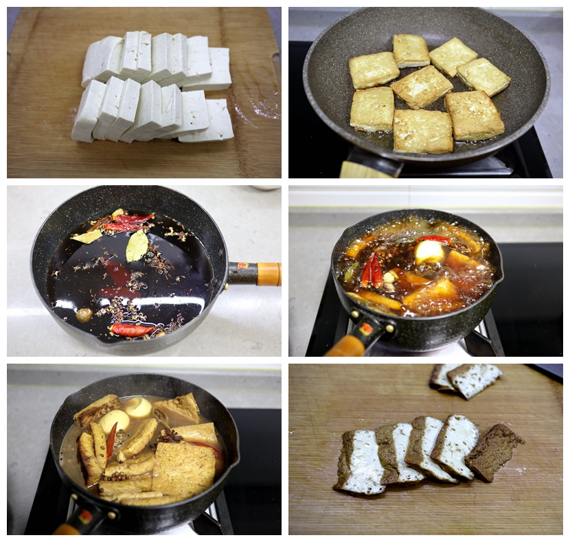 豆腐宜用质地结实的北豆腐,成型不易碎,切厚片油煎出薄薄一层破皮更利于成型;因为豆腐不易入味,卤水中可多放一点盐,想要热吃可多煮一会儿,想要凉吃煮10分钟后关火,泡卤水中一夜可充分入味。