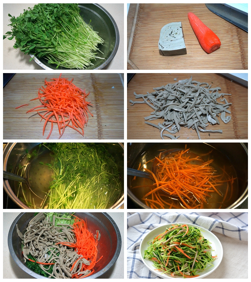 【材料】豌豆苗1把,五香豆腐丝1块,胡萝卜半根,盐少许,芝麻油适量
